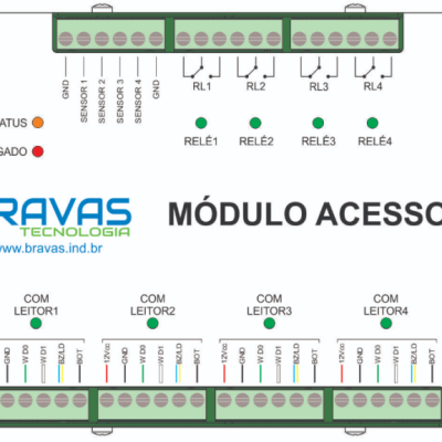 O Módulo Acesso Programável é um controlador de acessos que gerencia e controla os acessos de pessoas em qualquer ambiente. Com conexão ethernet permite usar o software que está incluso e criar regras de acessos, cadastros de usuários, abertura remota de portas, registro de eventos e demais configurações. Ainda permite expandir o controle para mais portas, catracas, portões e automações. Contempla uma API para integração. Tem 4 entradas Wiegand 26/34 bits para qualquer leitor de mercado, 4 entradas de botoeiras, 4 entradas de sensor de porta, 4 saídas relé e 2 canais RS485.